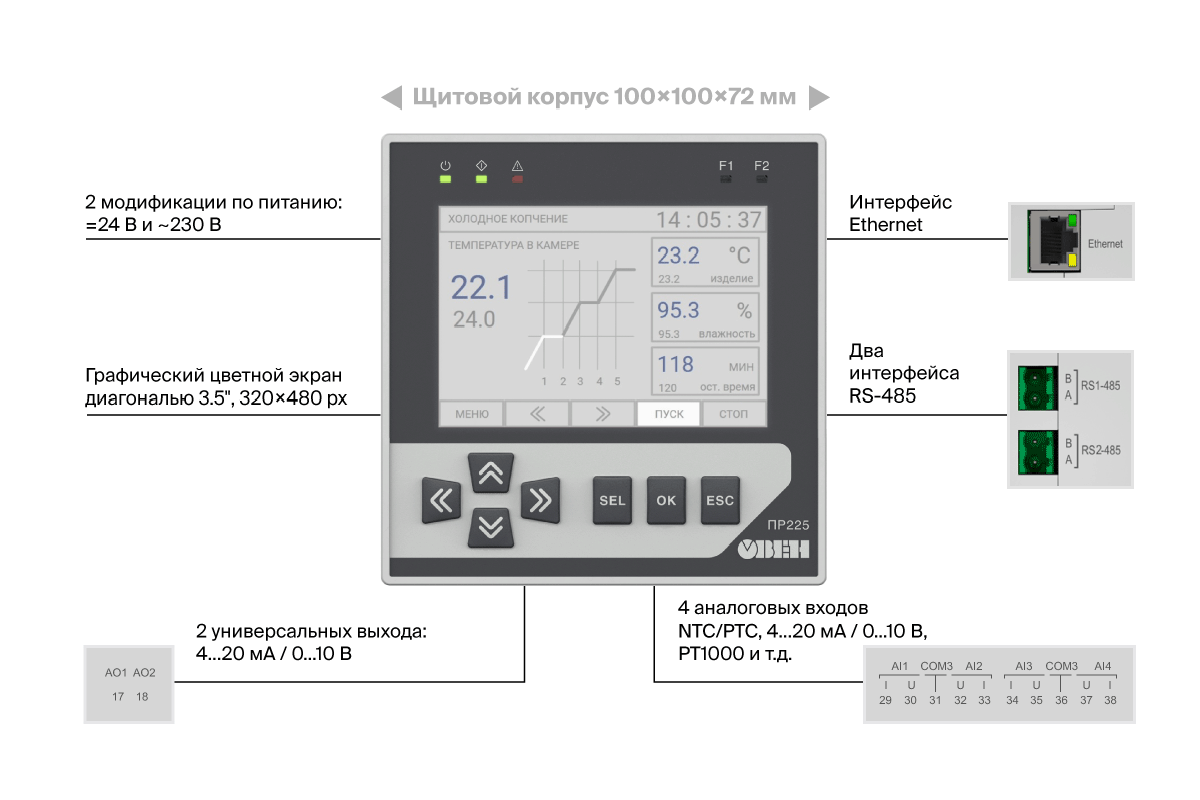 Независимо от модификации, все реле ПР225 обладают набором мощных характеристик. Устройство отличается удобным щитовым исполнением для монтажа в стандартный щит и оснащено ярким 3,5” IPS-дисплеем для отличной видимости данных. Гибкое программирование осуществляется в интуитивной среде OwenLogic, что позволяет быстро настроить логику работы без глубоких знаний в программировании. Благодаря поддержке интерфейсов связи (Ethernet, два RS-485 и современный USB Type-C) и возможности простого масштабирования количества каналов ввода/вывода с помощью модулей расширения Мх210 и Мх110, реле легко адаптируется под растущие задачи. Ключевым преимуществом является прямая облачная интеграция с платформой OwenCloud для удаленного мониторинга и управления вашими системами.